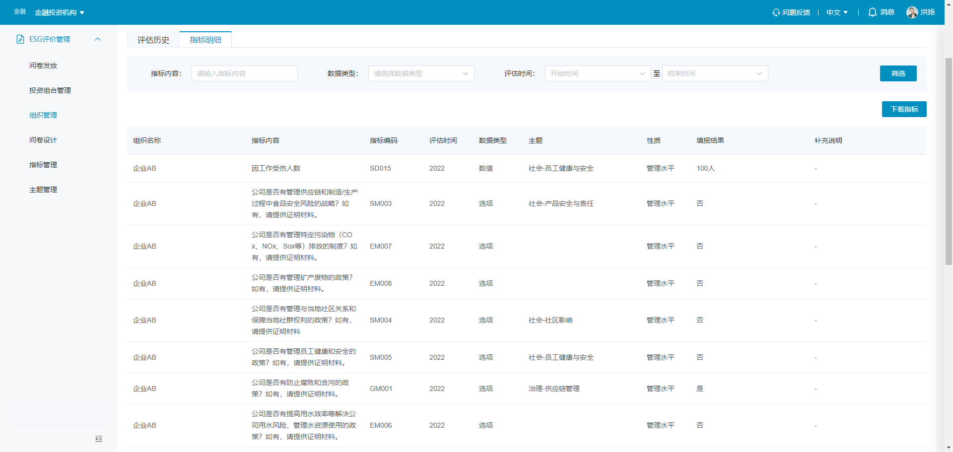 指标明细 指标明细页将企业历年填报的每一份问卷中的指标的填报内容记录在此,便于企业快速,方便的查找历史填报明细。