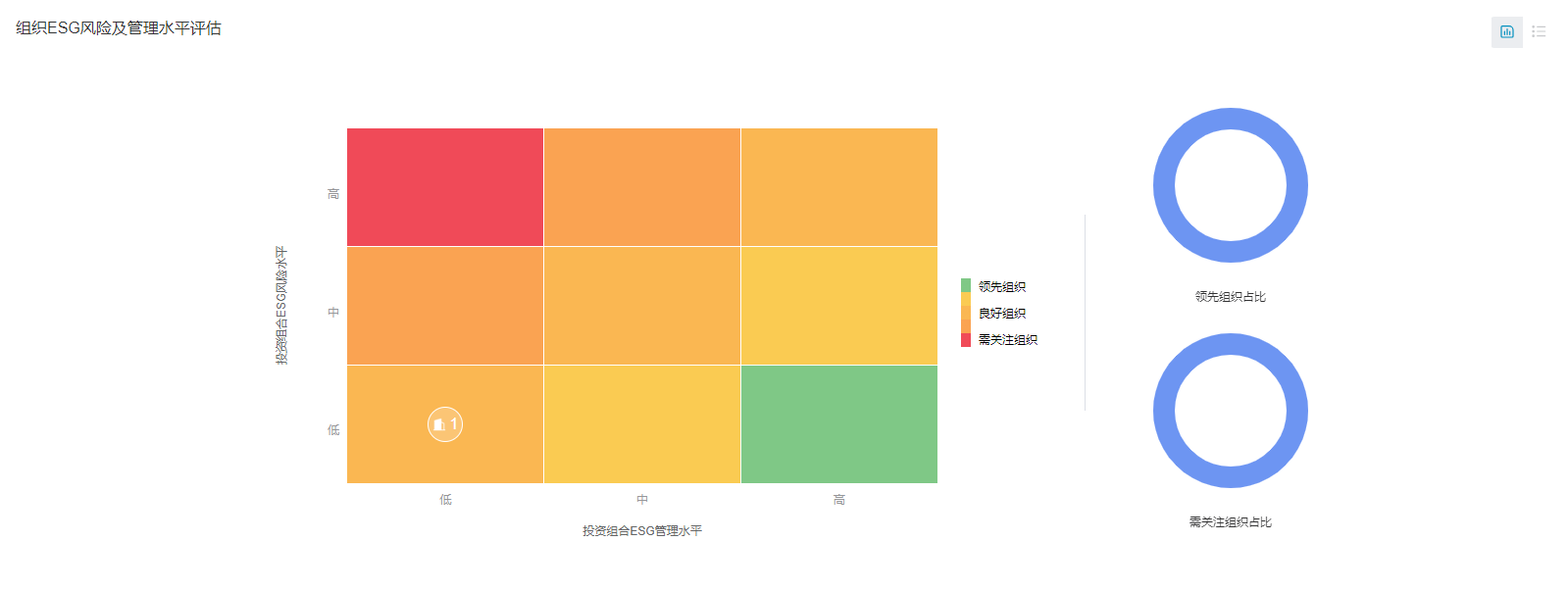 - 组织ESG风险及管理水平评估:支持预设风险类和管理里指标,根据企业填报内容对企业进行管理、风险和总体的ESG评分,并对企业进行分级,由好至差分别为领先组织、良好组织和需关注组织。