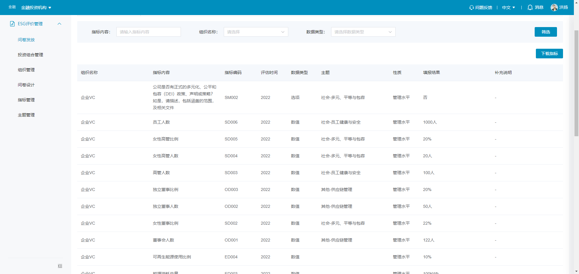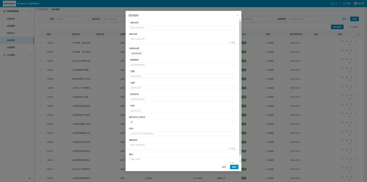 - 主题:指标的主题属性配置,一级主题默认为环境、社会、治理、基金管理人ESG调研问题、其他;下级主题由用户自行添加,可添加多级;指标必须挂在非一级主题上,所以用户需自行先把主题数据维护好。