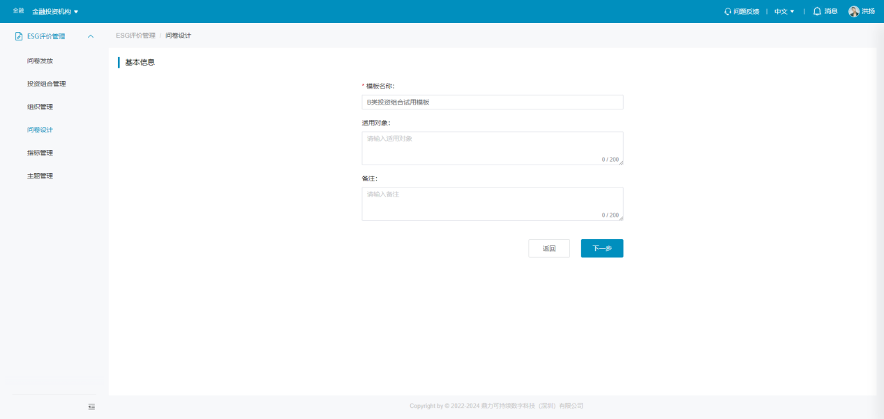 问卷设计模块用于维护问卷指标模板。企业事先在此创建好适用于不同投资组合、不同使用场景、不同时间节点的问卷模板后,在创建问卷时,选择对应的模板便等同于配置问卷填报指标,这样便可以节省每次创建问卷时配置指标所用的时间。