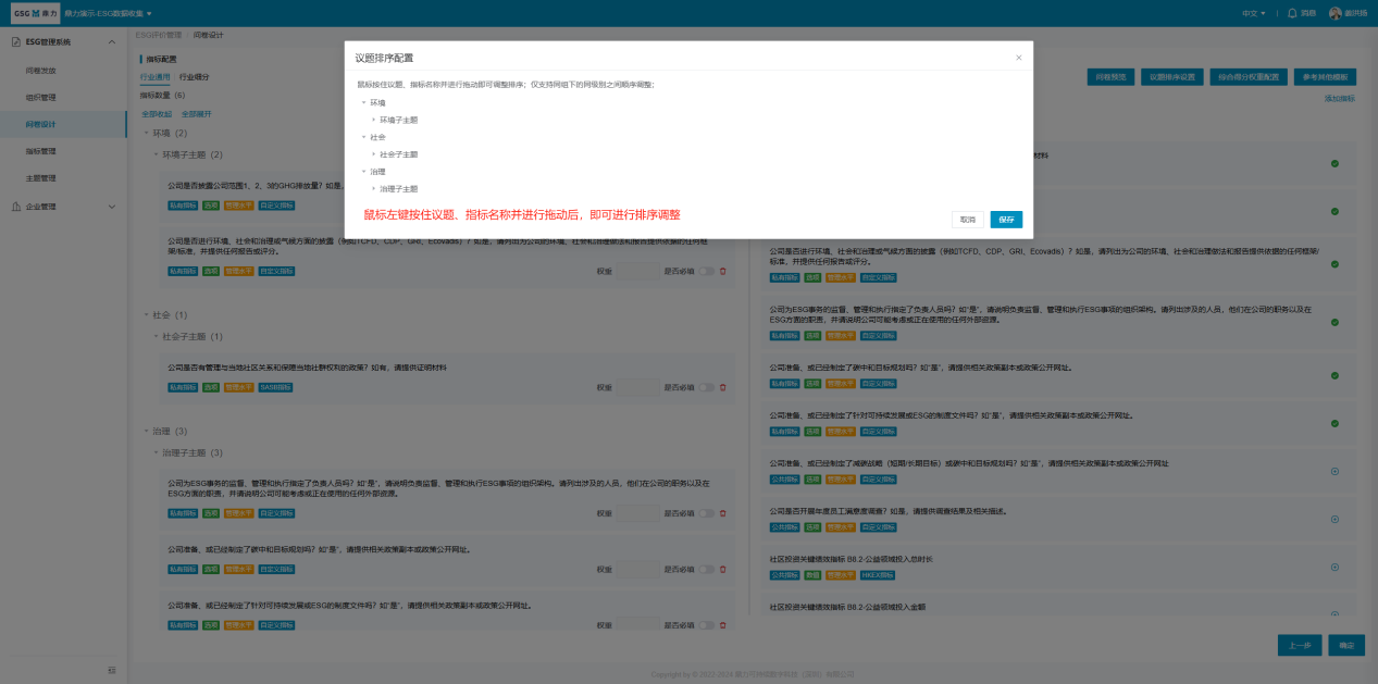 已配置的指标,将会按指标所属议题进行分组展示;用户可自行调整各议题、指标的排序;调整后,填报问卷内也会按此排序进行展示;