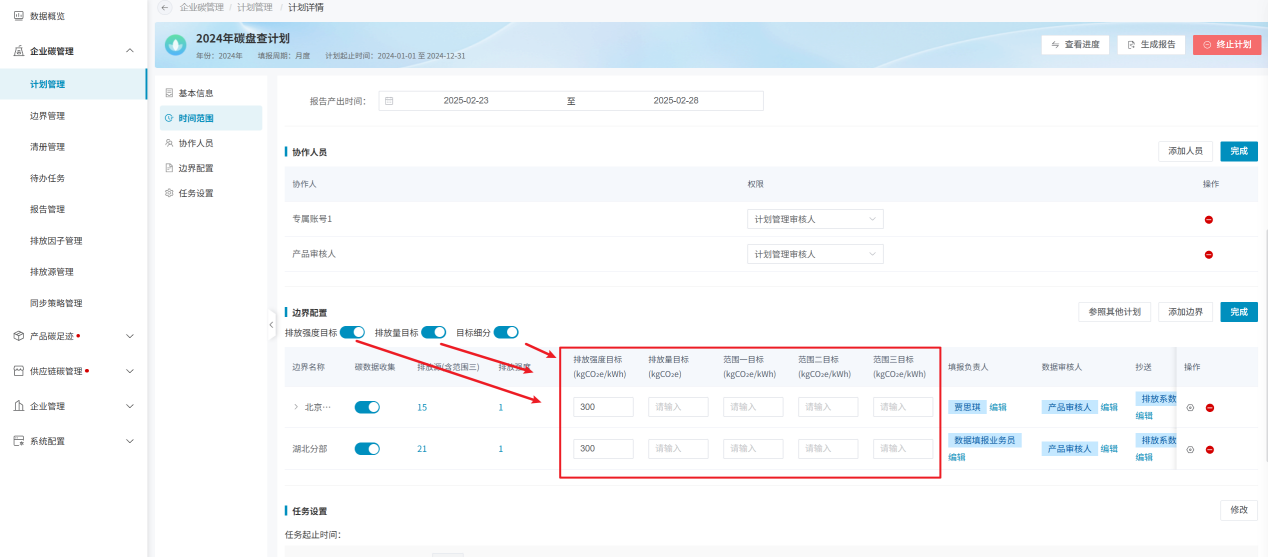 计划的基本信息里“排放强度范围”选择排放强度类型均需边界填报数值,因此需在此设置每个排放强度类型的填报人。