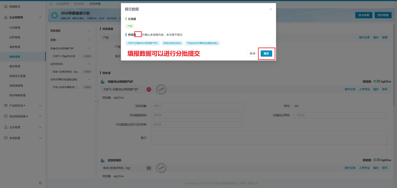 待办任务模块,用于填报排放源、物料的活动数据,及数据的审核工作;此模块主要面向于被分配任务的相关责任人;填报页面主要范围三类数据的填报工作:排放强度数据、排放源数据及物料数据;
