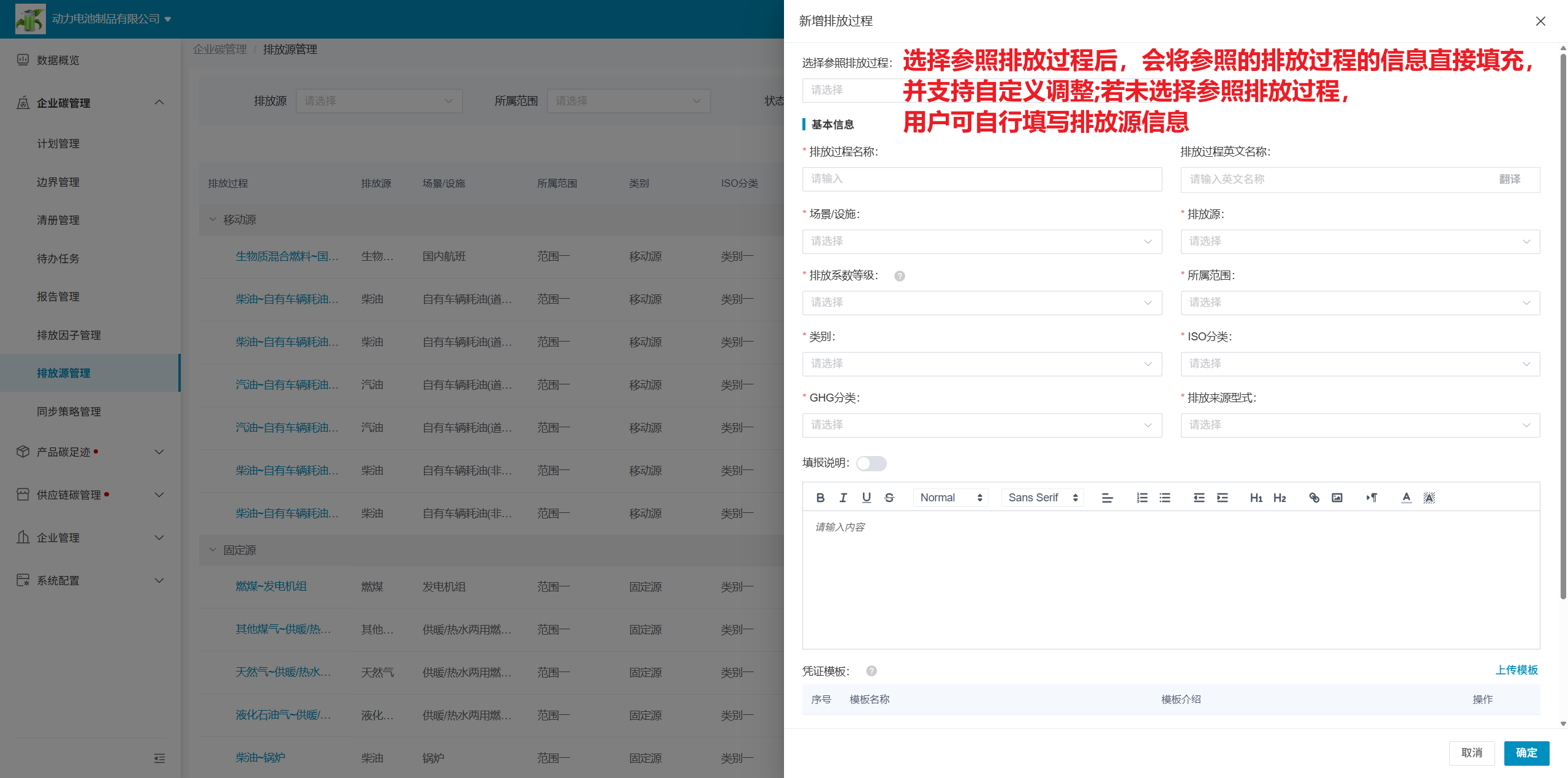 企业可自行新增排放源,但排放源的计算公式仅能从现有之中选取,企业可自行关联排放因子,自定义排放过程名称等基础信息;