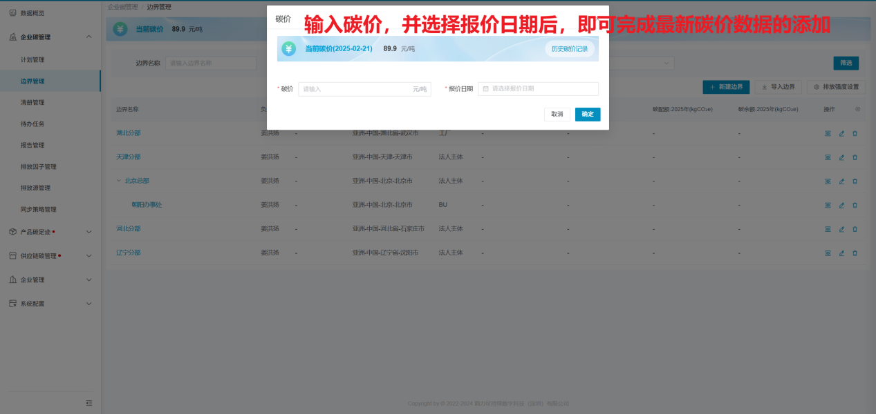 碳价数据由企业维护,将会实时显示最新的碳价信息;已添加的历史碳价数据将会保留并可随时查询。