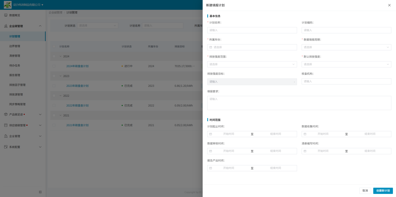 企业需通过创建年度碳排放盘查计划,进行相关排放源数据收集及碳排放计算;计划可实时查看填报、审批状态及实时碳排放数据监测。