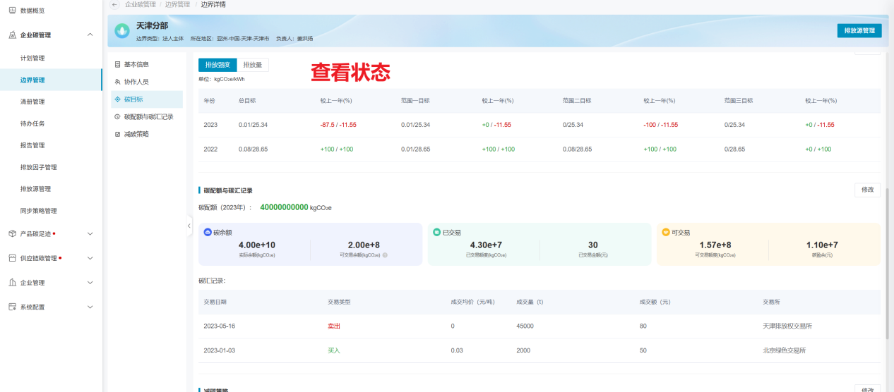 查看状态下,会同步展示当前目标范围的实际排放数值,并将实时排放数值和目标值与上一年的数值进行同比。