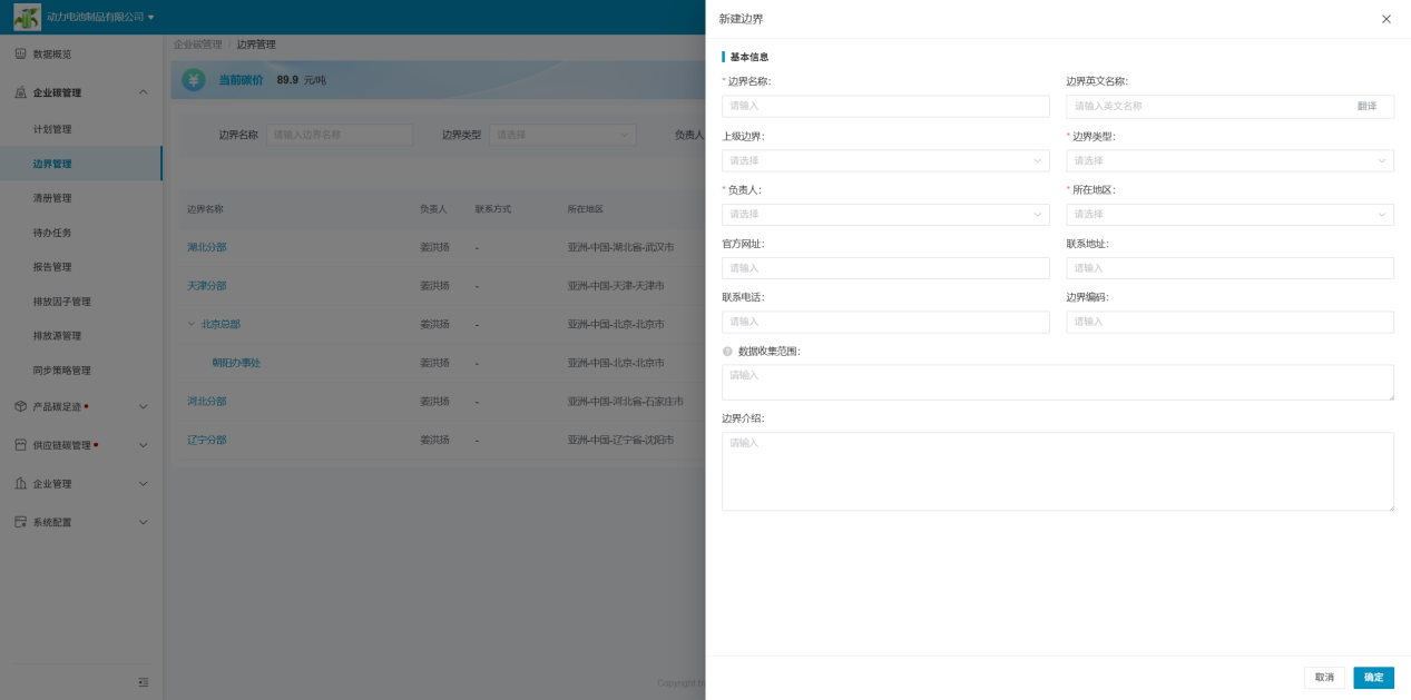 “边界”作为企业进行碳盘查的排放主体,需要企业在创建碳盘查计划前,先创建并维护好边界信息。点击“新建边界”后,在弹窗内添加边界相关信息即可。