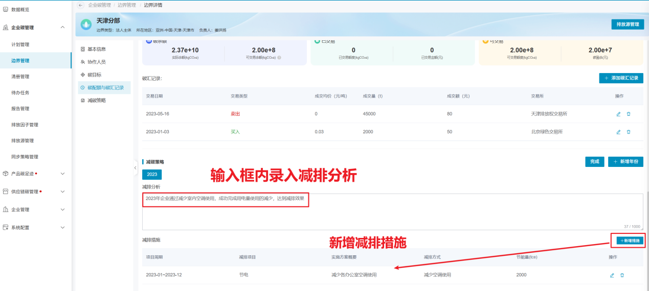 企业录入每年的减排分析内容和减排具体措施,以年度进行录入。