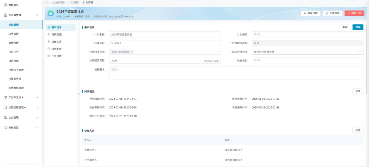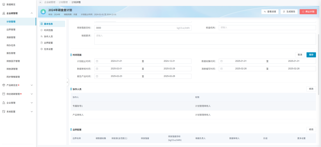 计划创建成功后,即可进入计划详细信息页面。计划信息主要包括基本信息、时间范围、协作人员、边界配置、任务设置5个模块;同时包括计划开启/终止、查看计划进度和生成报告功能;