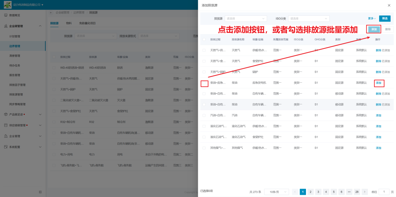 系统已将所有排放源信息配置好并提供给企业进行选取使用,边界只需根据实际情况将涉及到的排放源添加进边界即可。