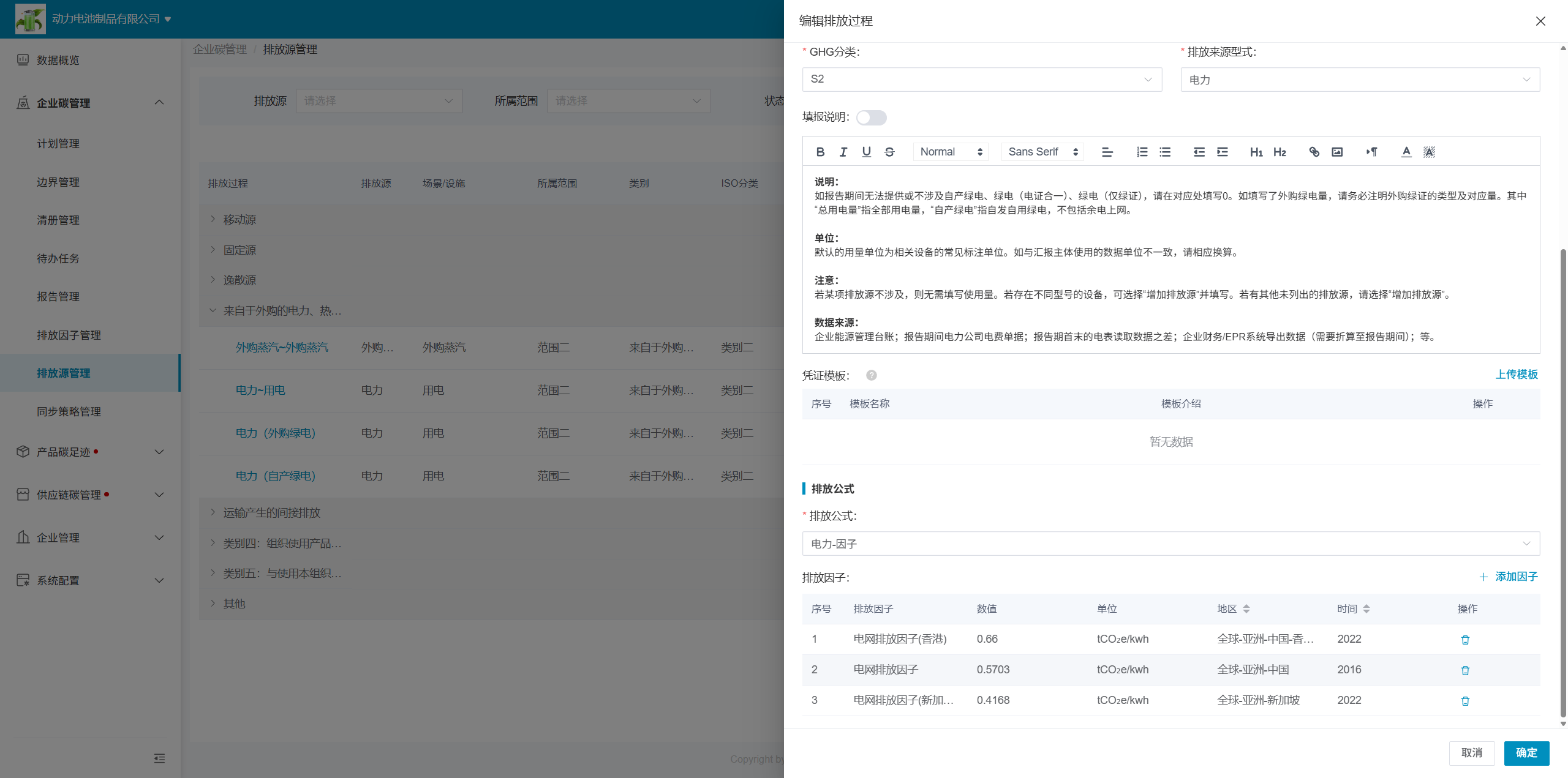 系统已提前将所有排放源设置好并提供给企业使用,并支持企业新增排放源、更改排放因子数值、保存排放因子版本等操作。