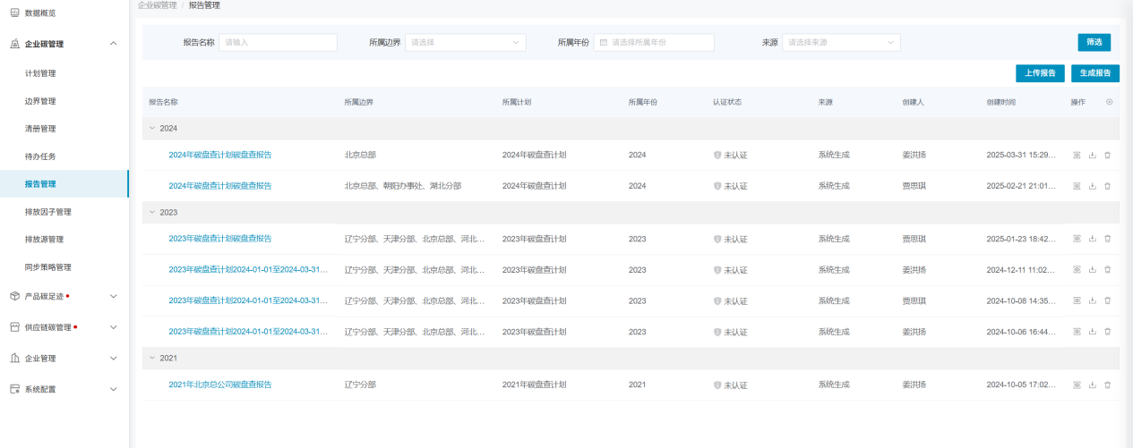 企业可将历年已经做过的碳盘查报告上传至系统内,在系统内进行数据留存,以保证企业历年碳盘查数据的完整性。上传报告时,同样是会生成一份报告数据,数据来源为自行上传;平台生成的报告的数据来源为系统生成。