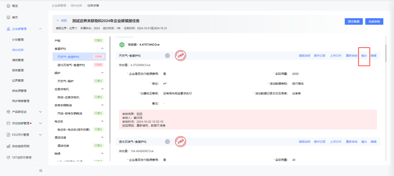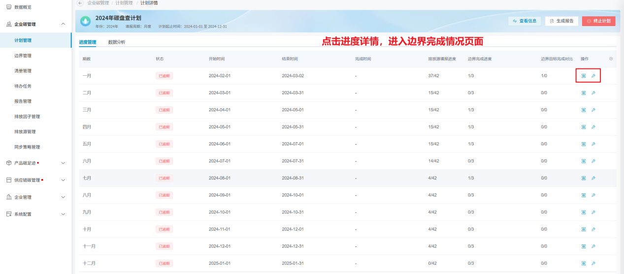 进入边界完成情况页,可点击各边界操作栏内的“查看”,进入当前边界的数据填报、审核页,查看各排放源、物料的实时完成进度。
