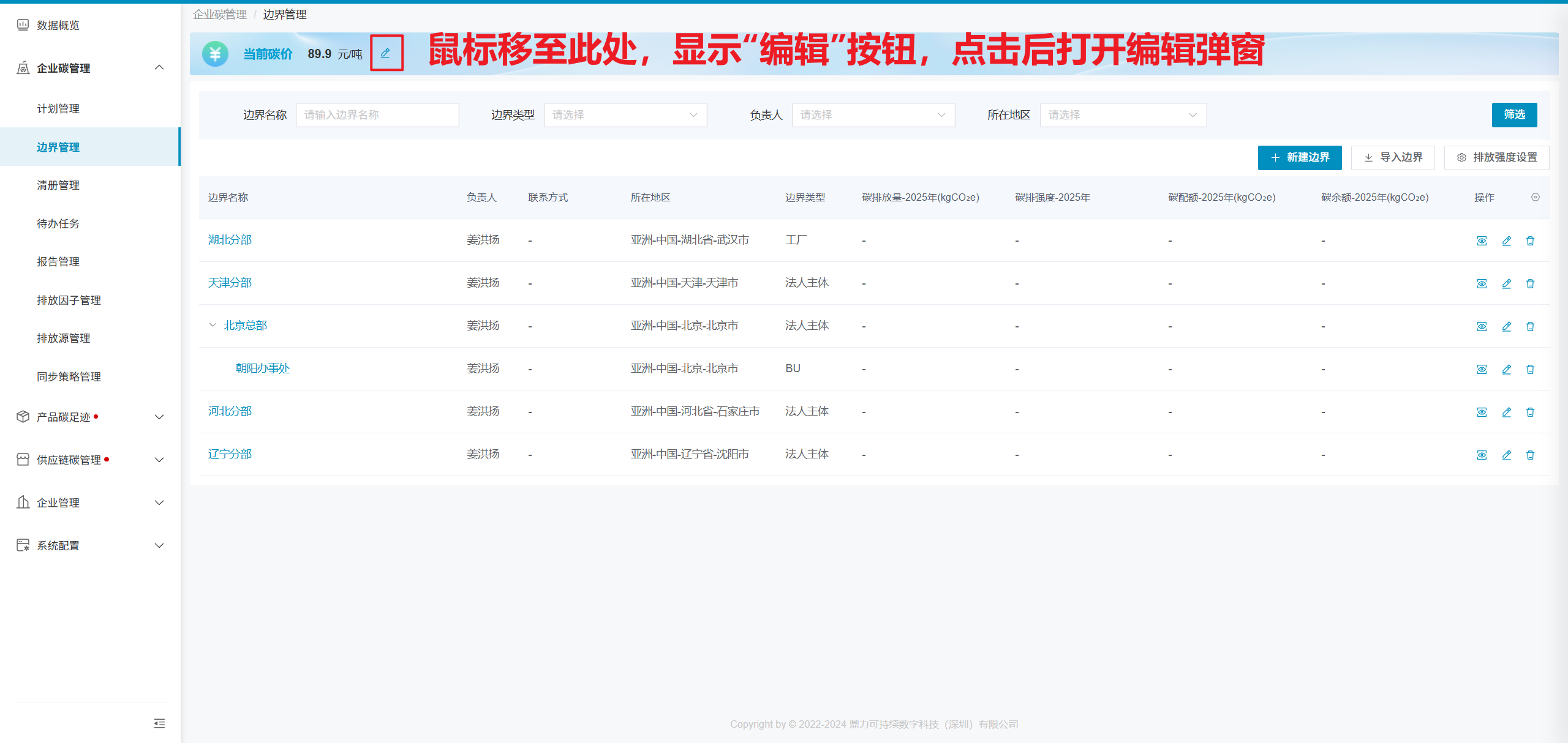 企业自行维护边界的碳配额信息和碳汇记录。若无碳配额信息管理,可直接关闭碳配额管理模块。