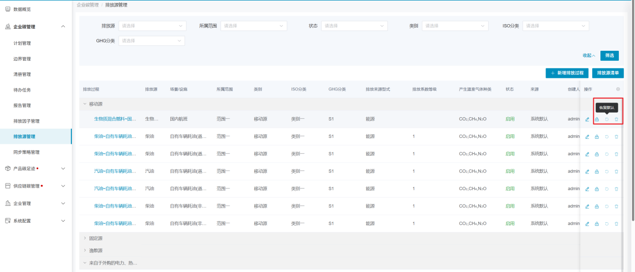 若企业无意更改了系统默认的排放源信息,如基本信息或因子数值等,可点击“恢复默认”,将数据恢复至原始数据。企业自行添加的排放源不支持恢复默认操作。