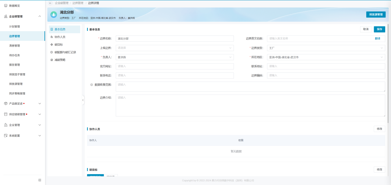完成边界创建后,即可进入边界详细信息页面。边界信息分为五个模块:基本信息、协作人员、碳目标、碳配额与碳汇记录、减碳策略,各模块介绍如下: