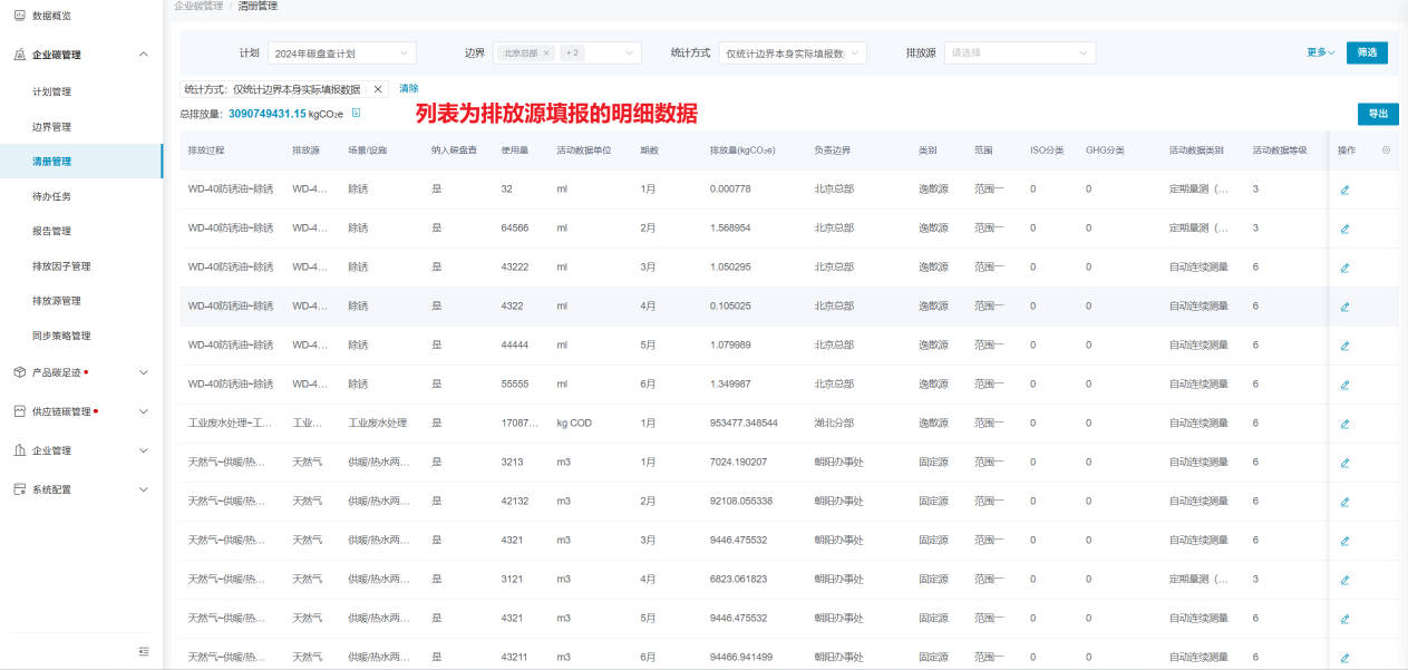 清册管理模块以单计划为统计范围,将边界填报的排放源、物料的明细数据一一列出;同时支持数据导出,导出时既可导出列表样式的默认格式,也支持导出企业需要的定制化格式。