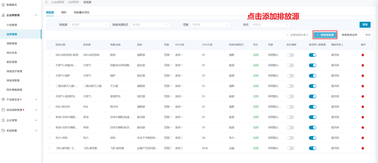 边界的排放源管理模块内,可管理边界涉及的排放源信息、采购的物料信息以及免除量化的项目信息。