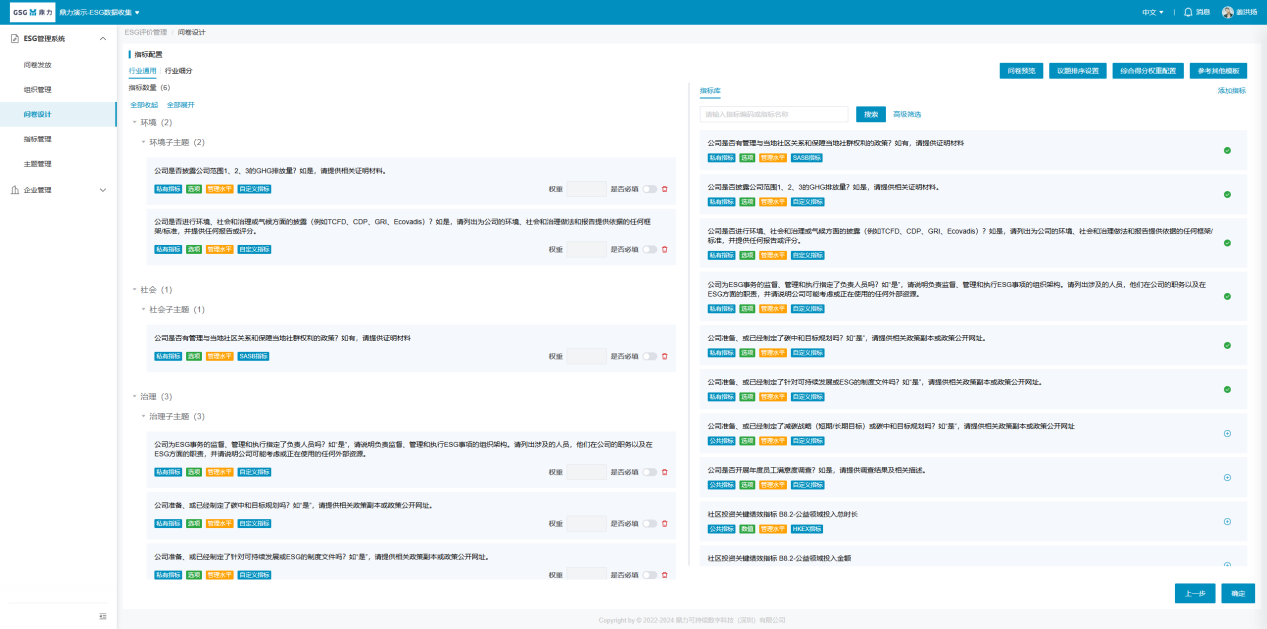 - 参考标准:配置指标所属的参考标准,目前支持HKEX指标、国企指标、ISSB指标、SASB指标和自定义指标;