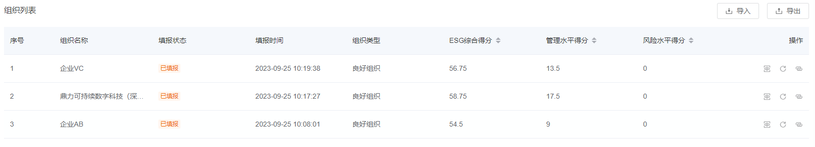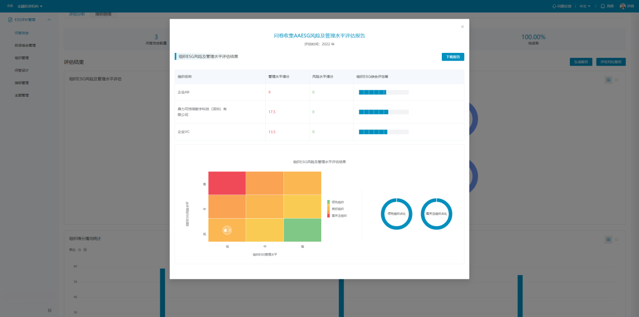 - 组织ESG风险及管理水平评估:支持预设风险类和管理里指标,根据企业填报内容对企业进行管理、风险和总体的ESG评分,并对企业进行分级,由好至差分别为领先组织、良好组织和需关注组织。