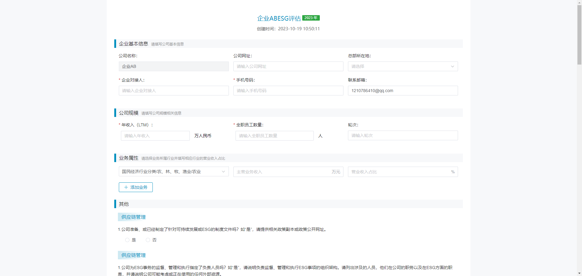 问卷创建成功后,系统会为问卷内的每个企业生成专属填报链接并发送至各企业负责人的邮箱,填报页内容如下: