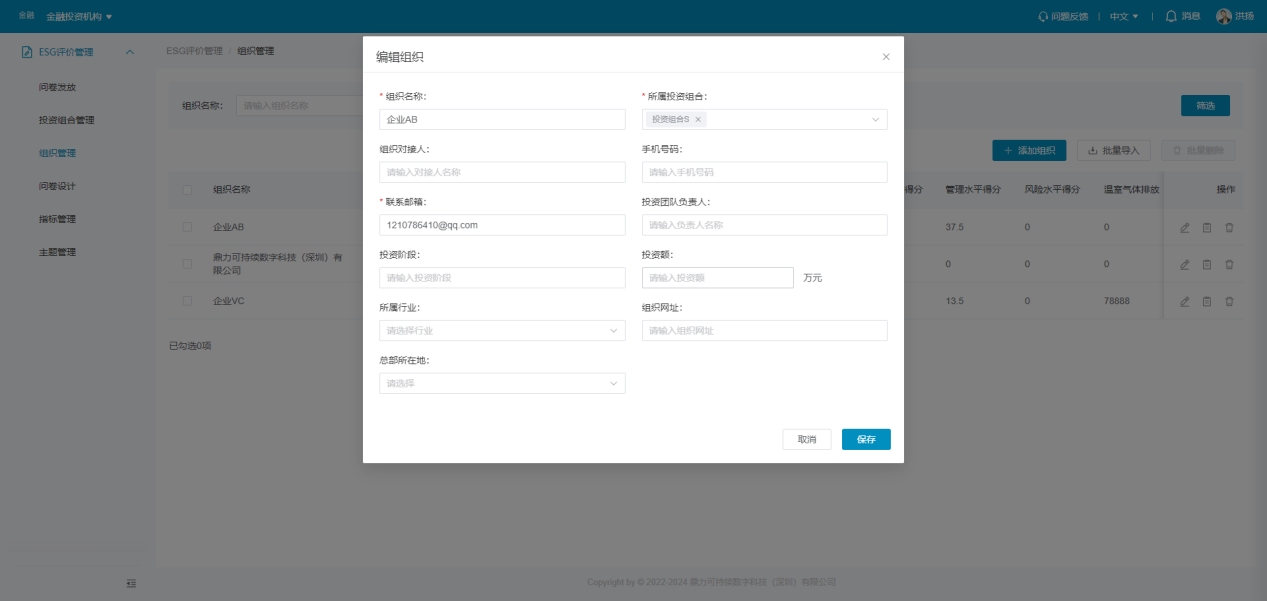点击“添加组织”按钮后在弹窗内完善组织信息,包括组织名称、所属组合等基本信息。其中“联系邮箱”必须填写,且邮箱最好为负责ESG数据收集的负责人邮箱,因为企业的专属填报链接将会直接发送至此邮箱内。
