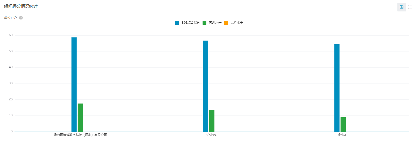 - 组织得分情况统计:以柱状图形式展示各企业的ESG综合得分、管理水平得分和风险水平得分情况。