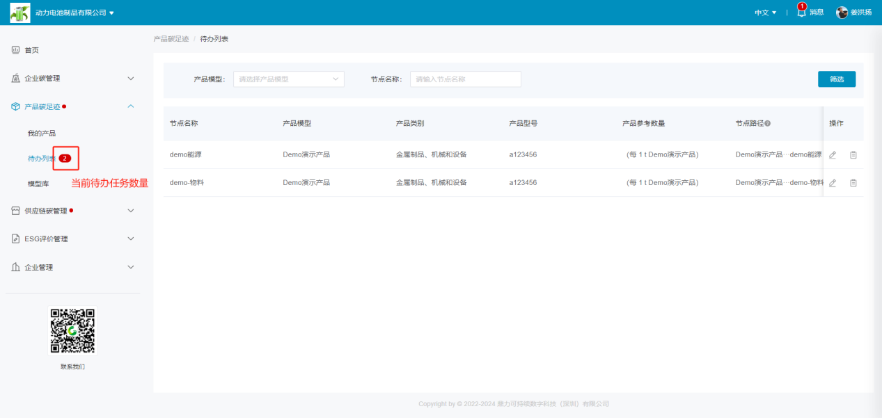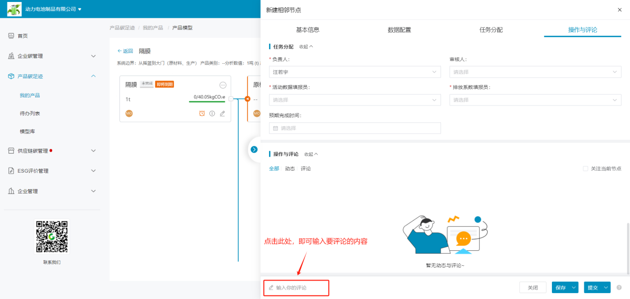 - 任务分配:可将节点的数据填报、数据审核工作指派给相关人员进行跟进;可选人员范围为已在系统内加入企业的用户;被指派的用户,会在左侧的“待办列表”里接收到待办任务;