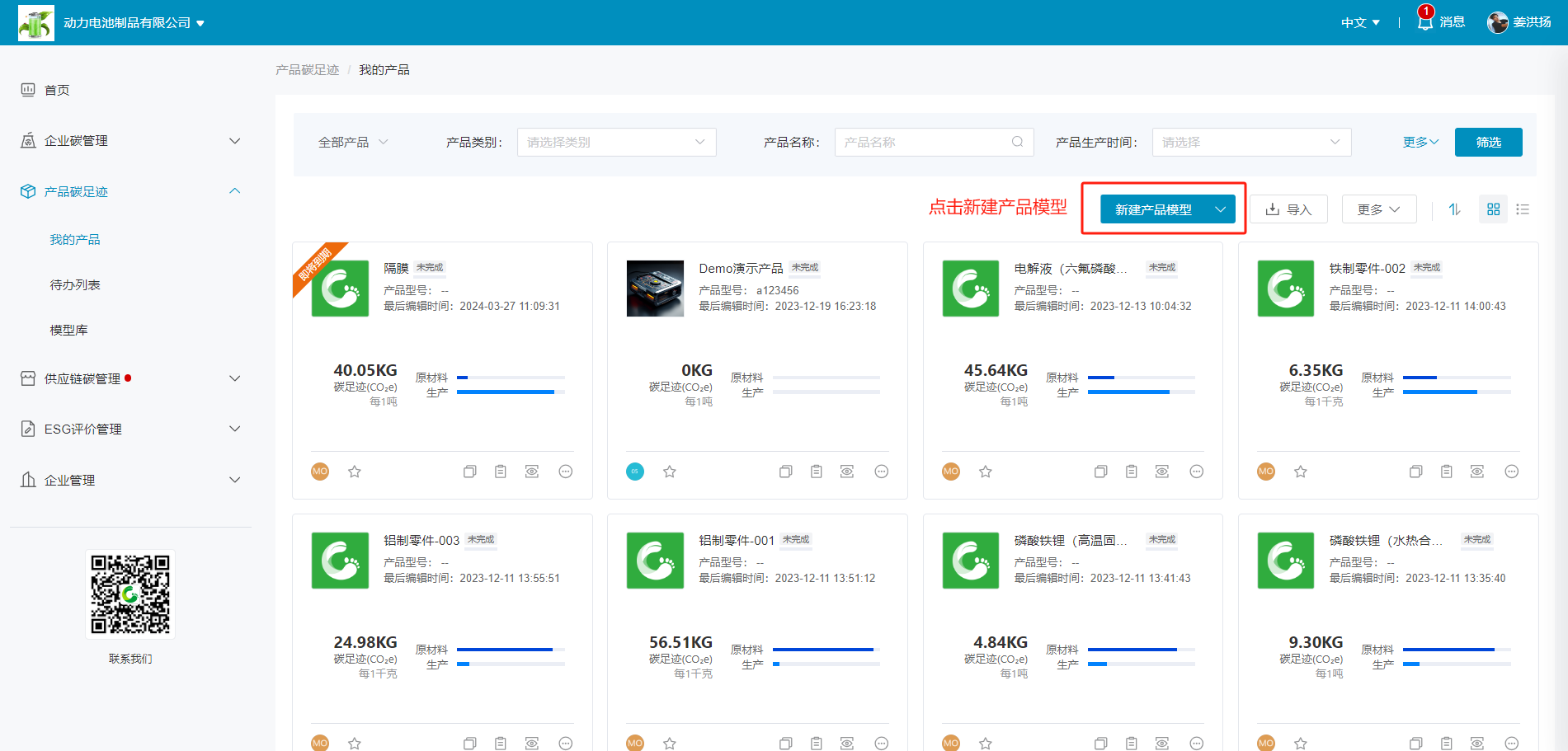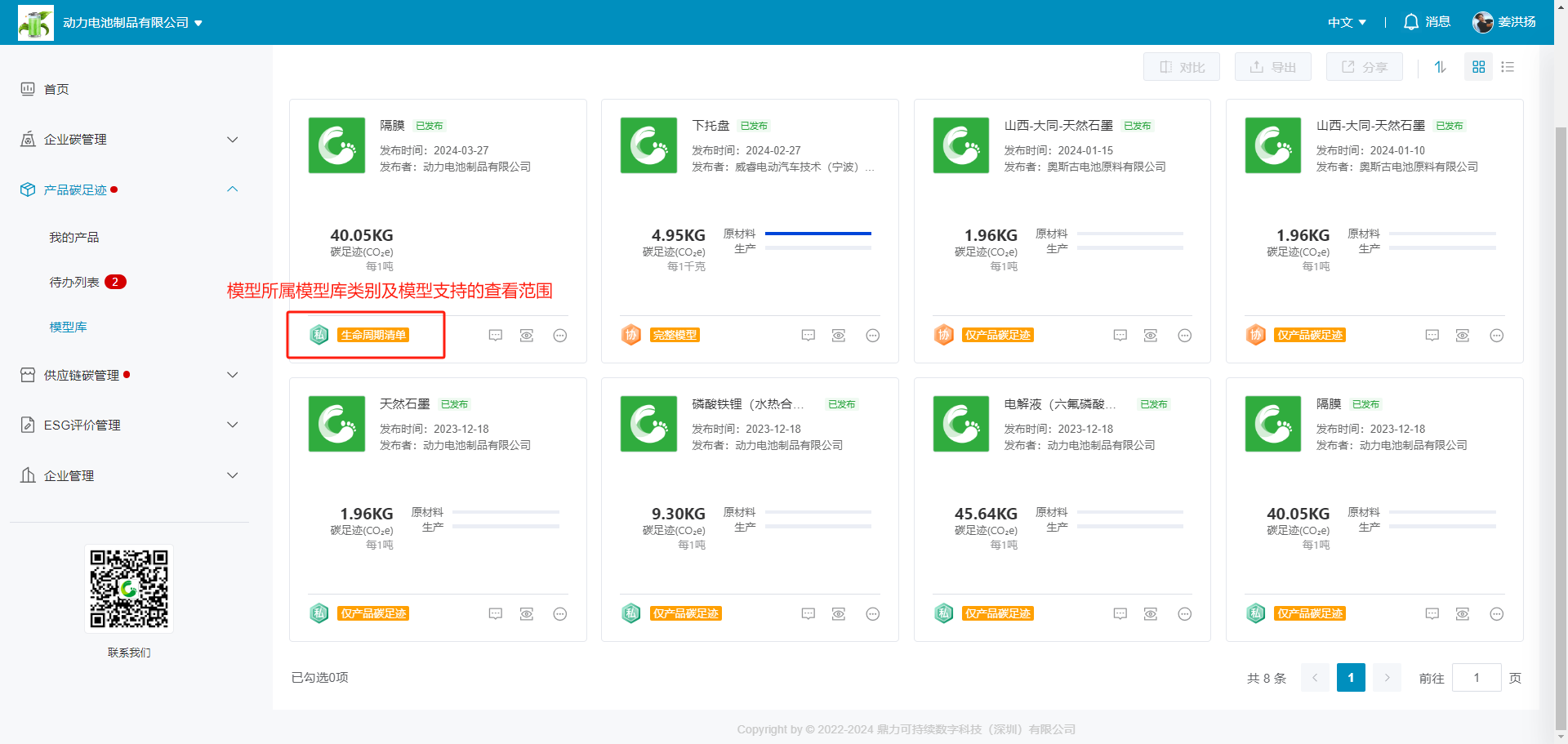 - 产品碳足迹:仅支持查看产品模型的碳排放情况;