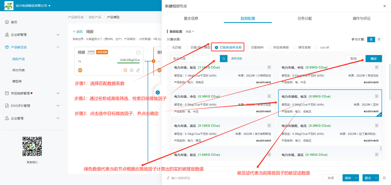 数据配置:主要功能是为当前节点匹配排放因子,进而计算当前节点的碳排放数值;碳排放数值=数量*排放因子;