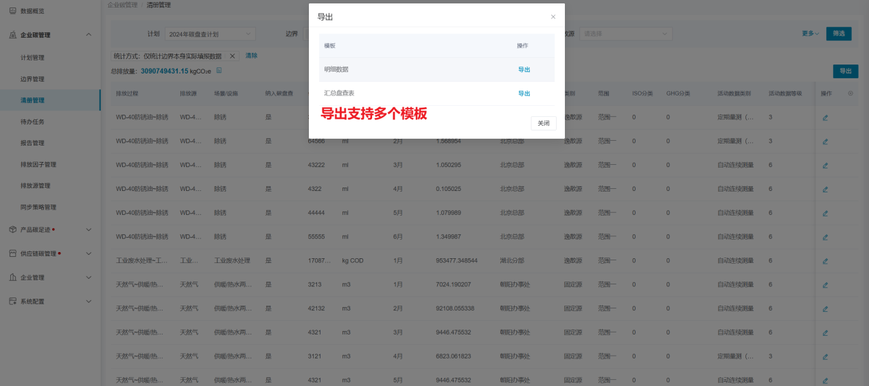 清册管理模块以单计划为统计范围,将边界填报的排放源、物料的明细数据一一列出;同时支持数据导出,导出时既可导出列表样式的默认格式,也支持导出企业需要的定制化格式。