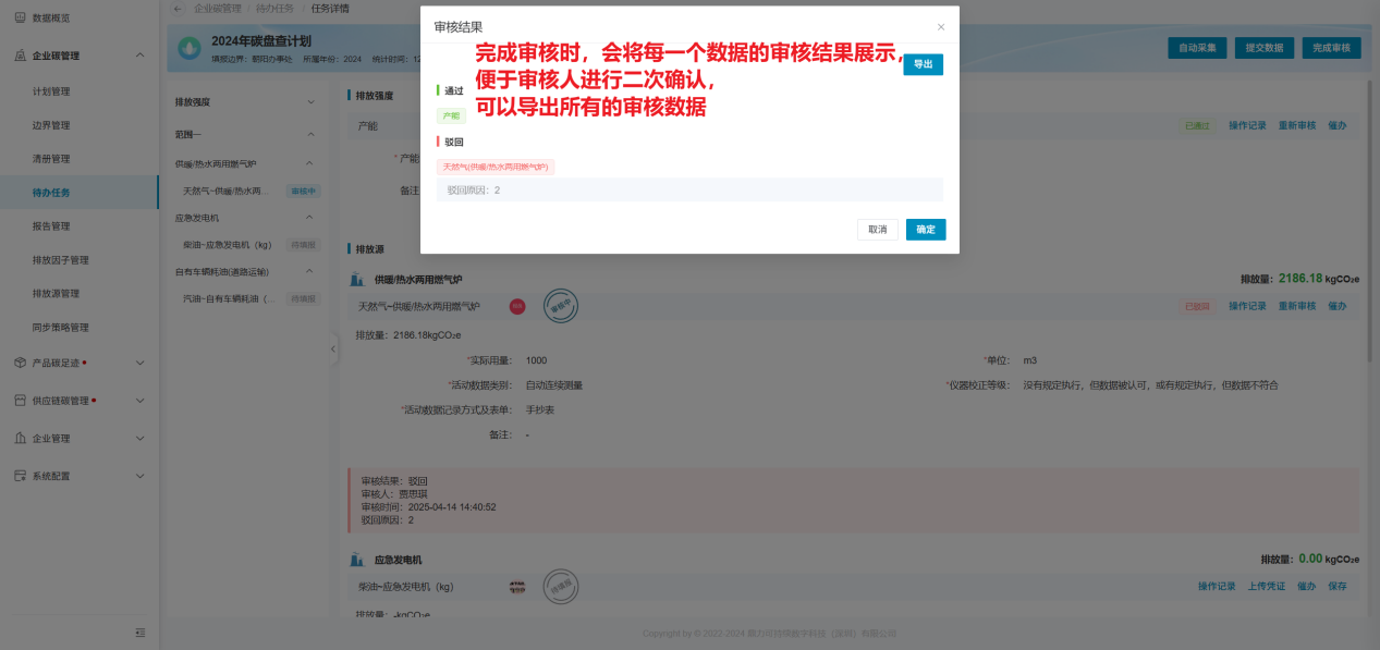 当所有数据均已审核后,便可点击“完成审核”按钮,将审核结果提交,对于驳回和建议优化的数据,将会退回至填报人进行重新填写;如果存在未给出审核结果的数据,则其他数据的审核结果均无法提交。