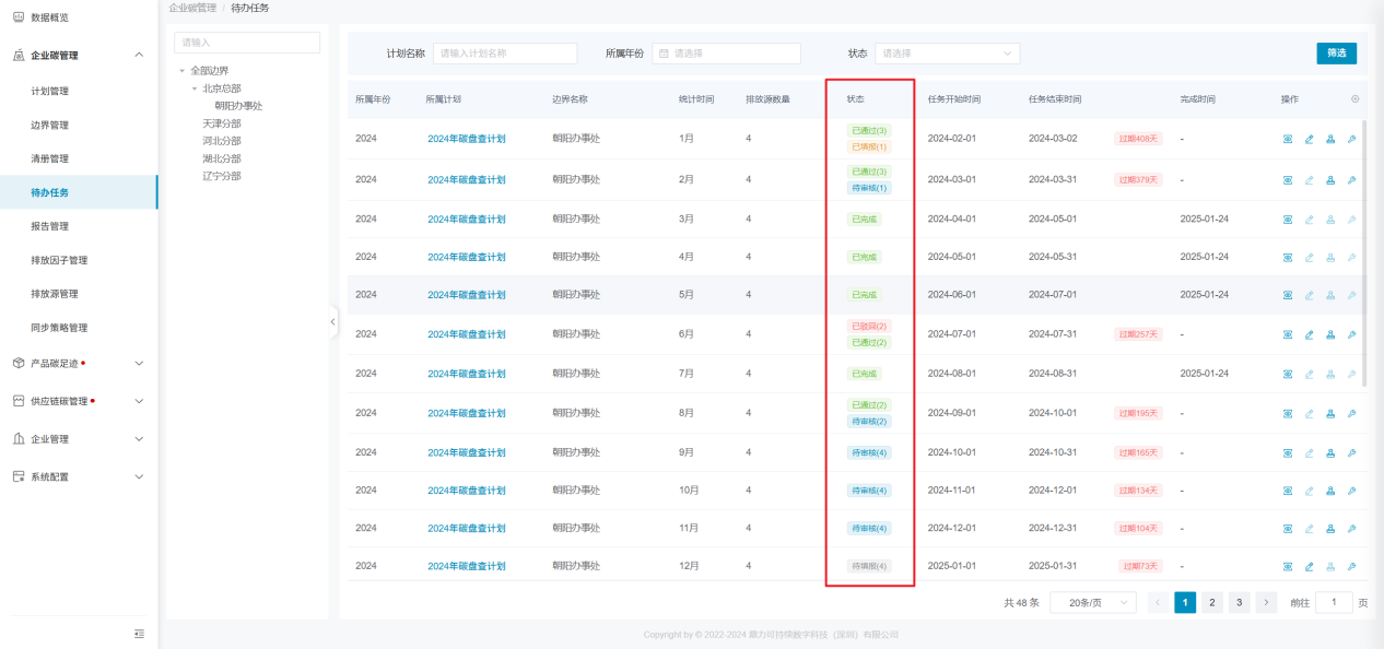 进入边界完成情况页,可点击各边界操作栏内的“查看”,进入当前边界的数据填报、审核页,查看各排放源、物料的实时完成进度。