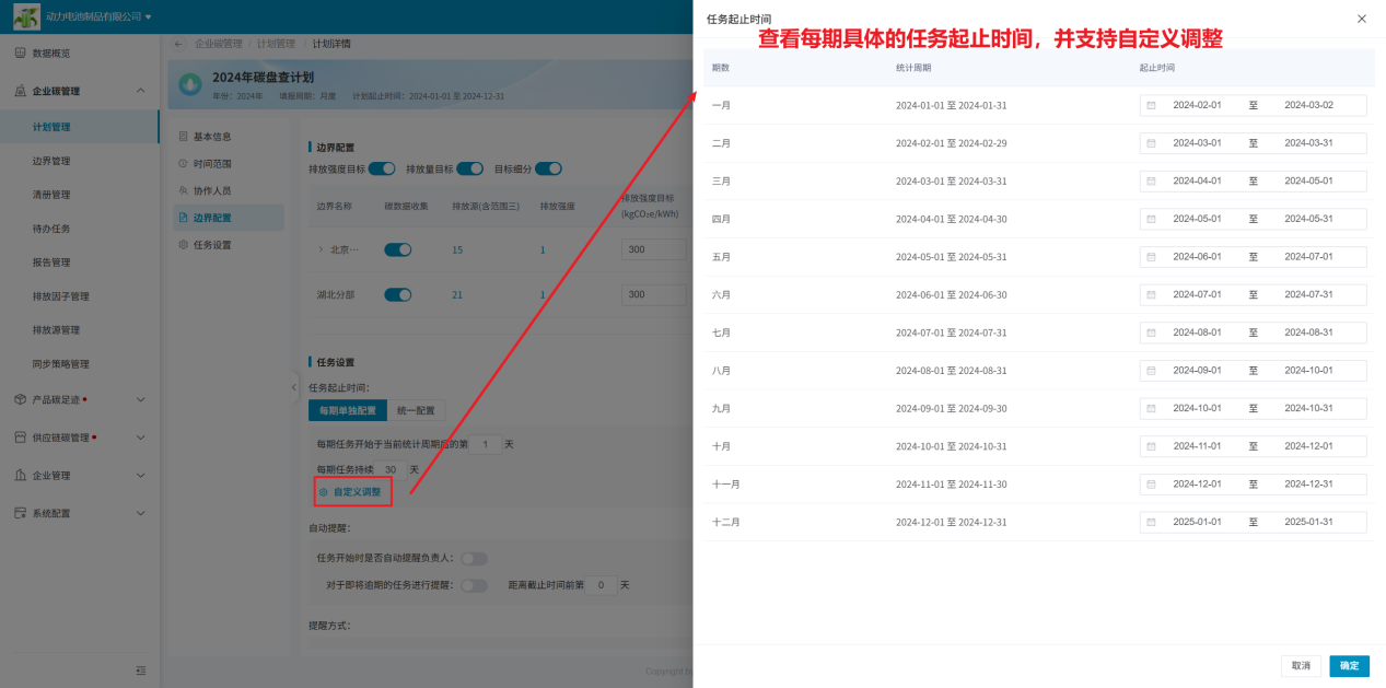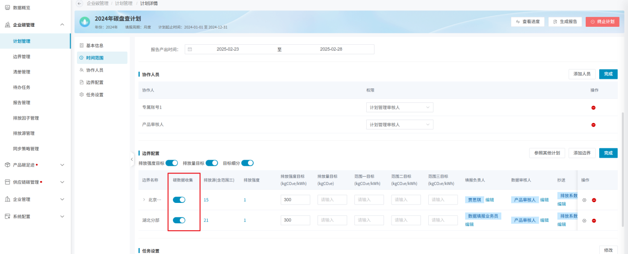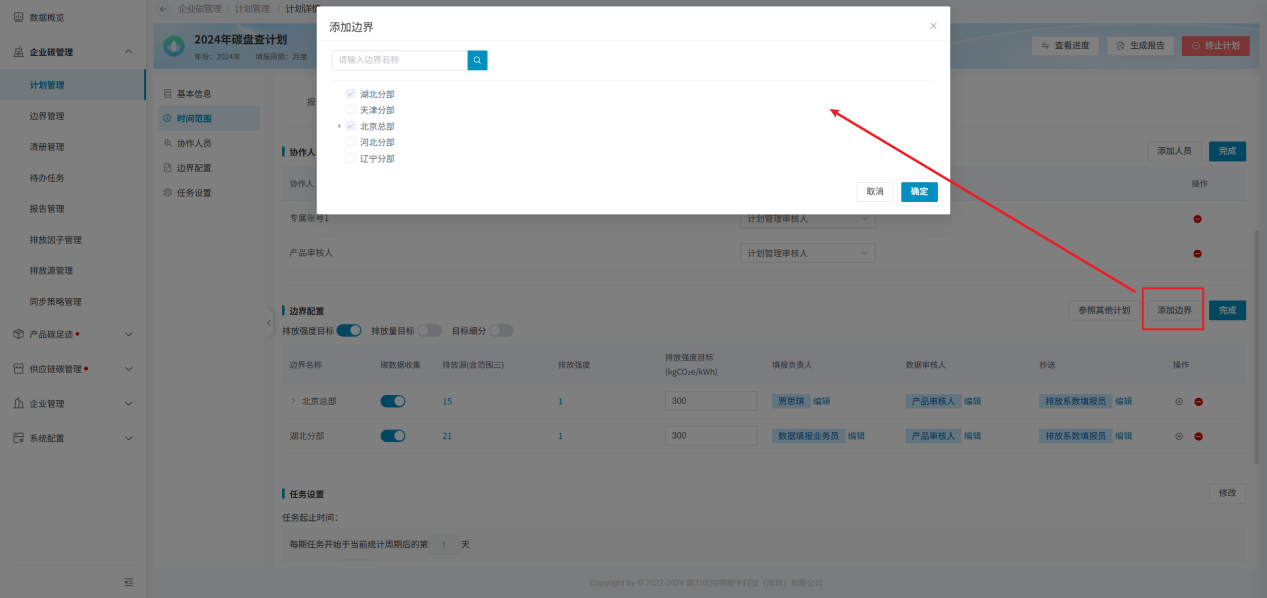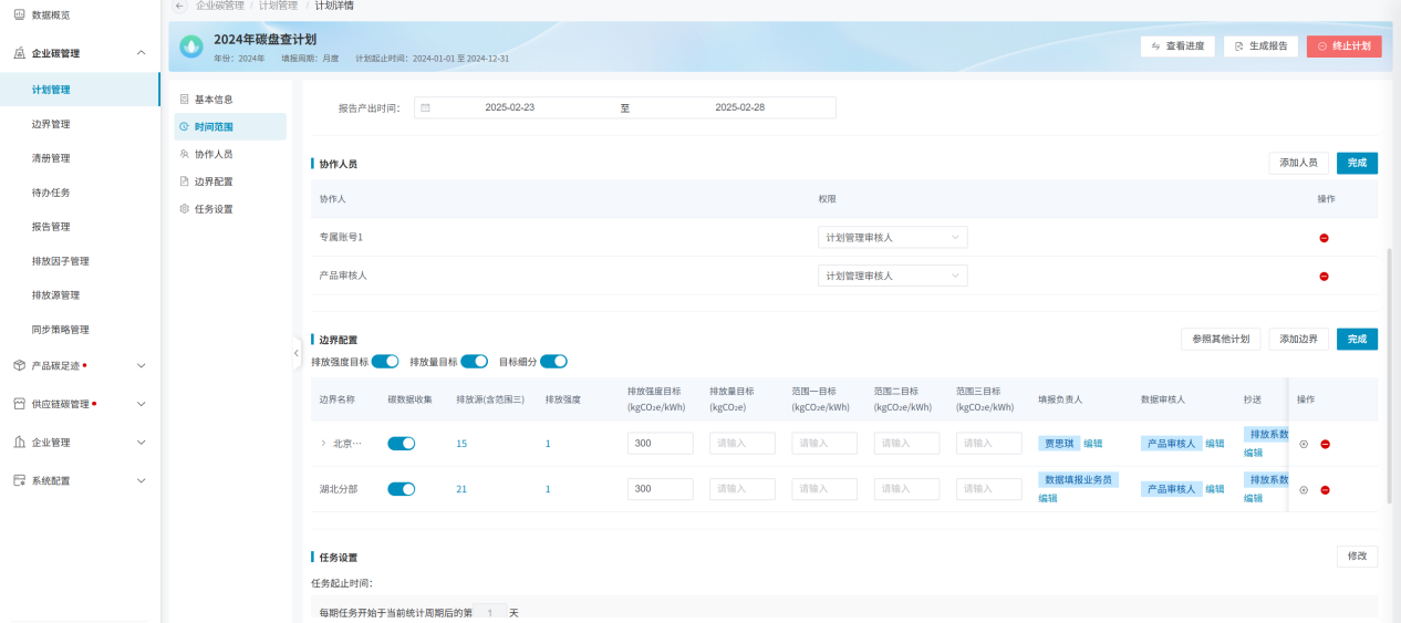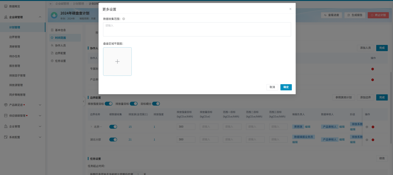 计划开启时,需要保证“边界配置”模块内,已添加边界信息,且边界下的排放源、物料、排放强度均需设置好填报人,以及边界的填报负责人、数据审核人均需设置好,否则计划无法开启;