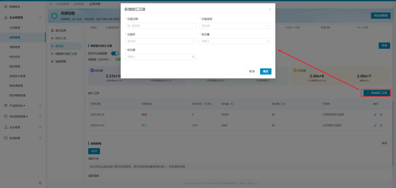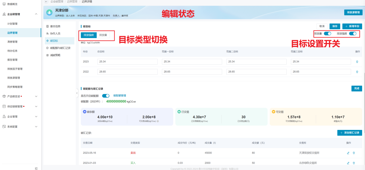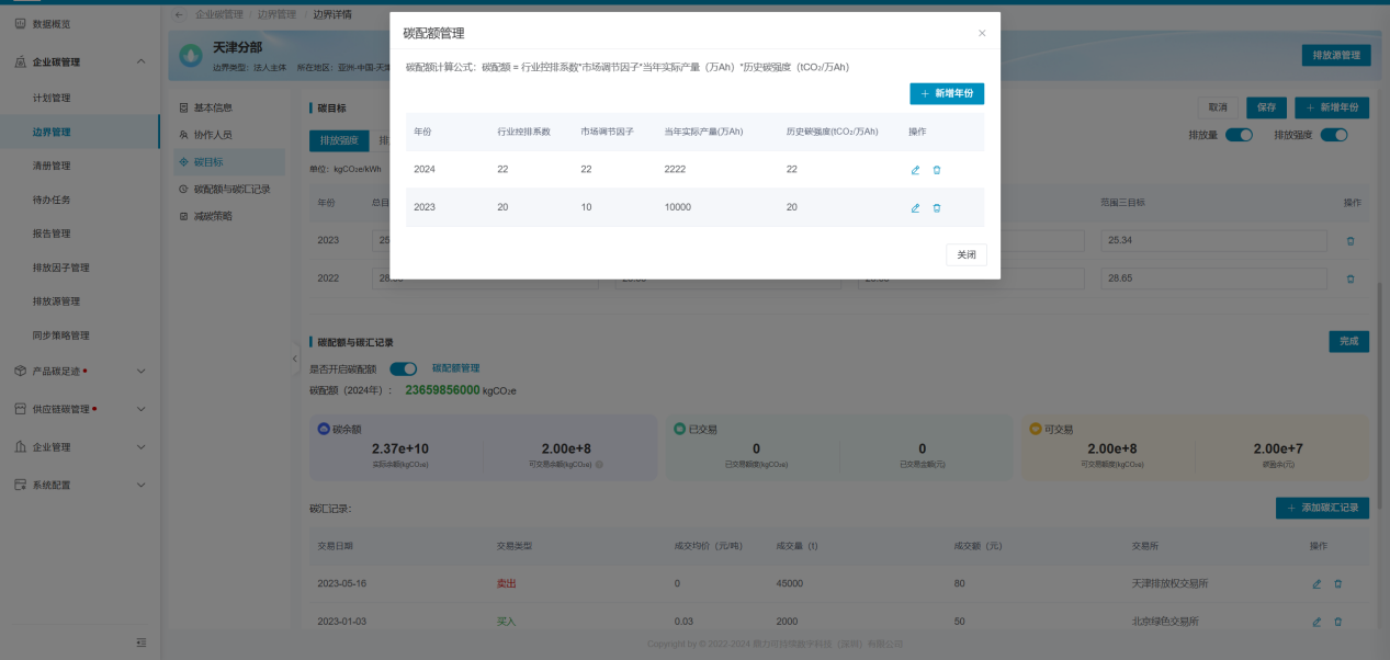 企业自行维护边界的碳配额信息和碳汇记录。若无碳配额信息管理,可直接关闭碳配额管理模块。