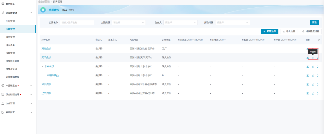 “边界”作为企业进行碳盘查的排放主体,需要企业在创建碳盘查计划前,先创建并维护好边界信息。点击“新建边界”后,在弹窗内添加边界相关信息即可。