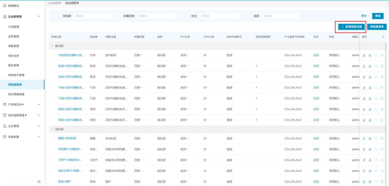 系统已提前将所有排放源设置好并提供给企业使用,并支持企业新增排放源、更改排放因子数值、保存排放因子版本等操作。