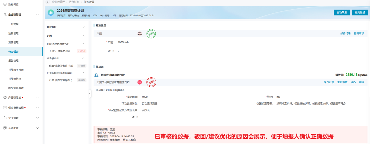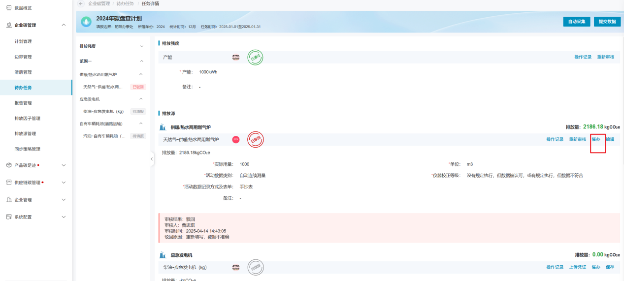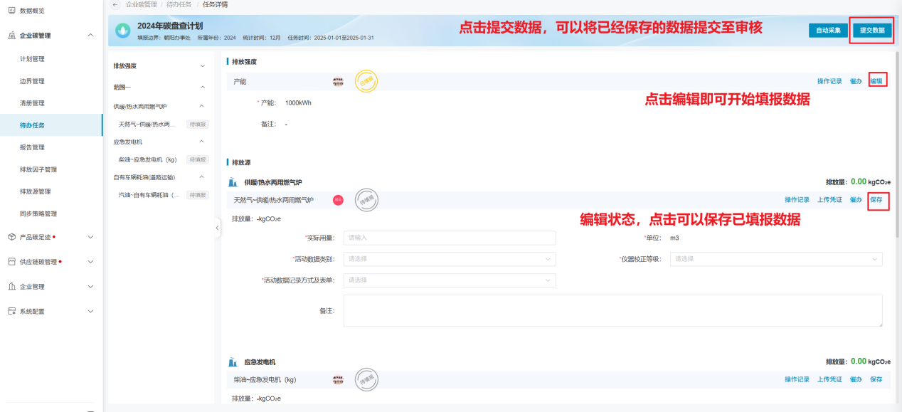 待办任务模块,用于填报排放源、物料的活动数据,及数据的审核工作;此模块主要面向于被分配任务的相关责任人;填报页面主要范围三类数据的填报工作:排放强度数据、排放源数据及物料数据;