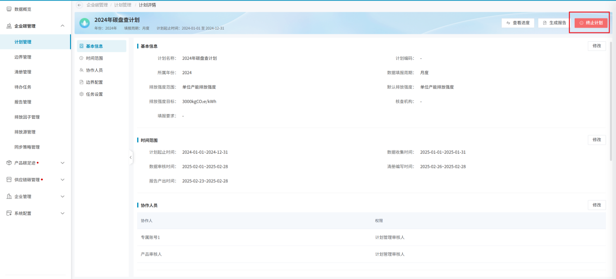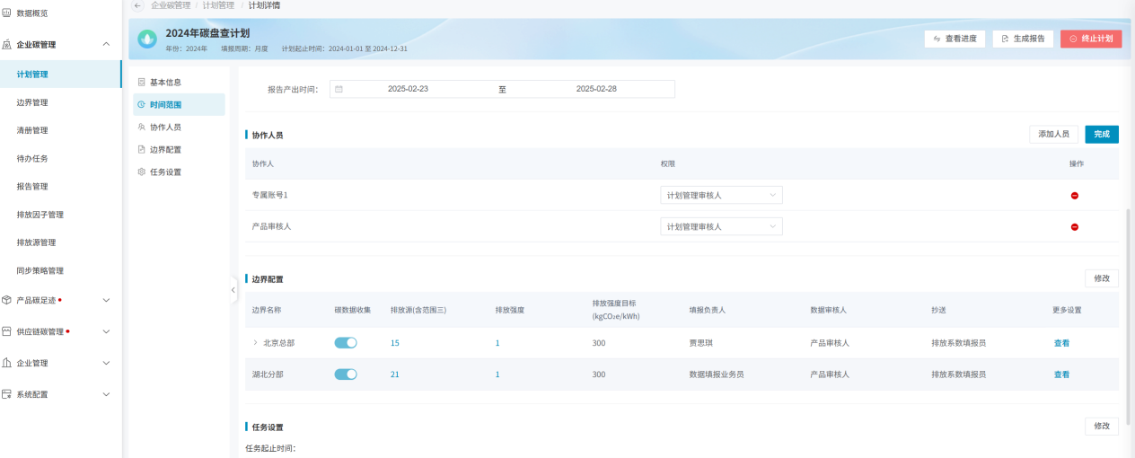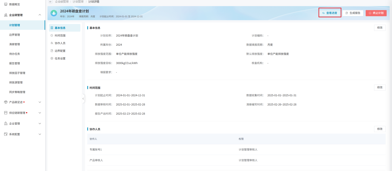 计划创建成功后,即可进入计划详细信息页面。计划信息主要包括基本信息、时间范围、协作人员、边界配置、任务设置5个模块;同时包括计划开启/终止、查看计划进度和生成报告功能;