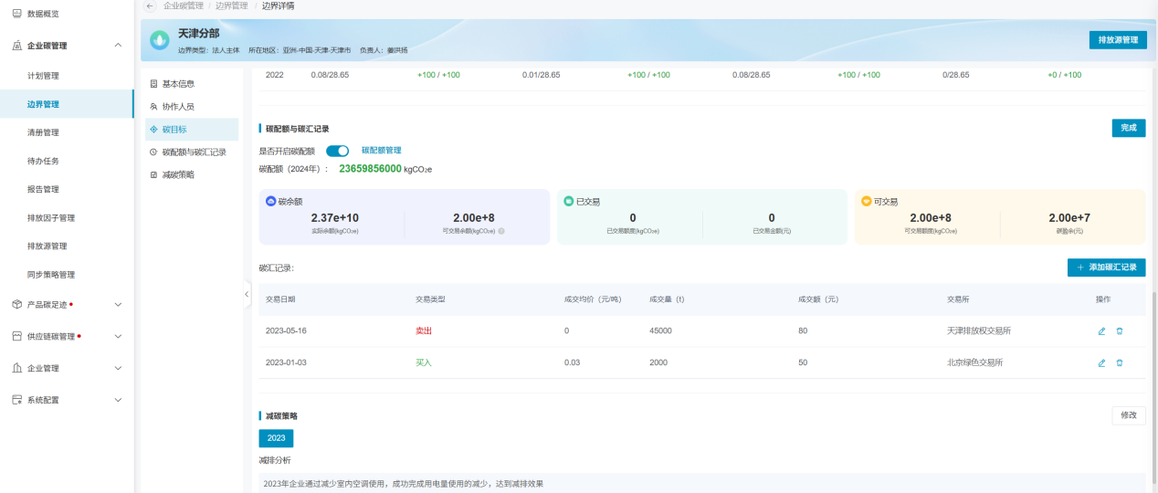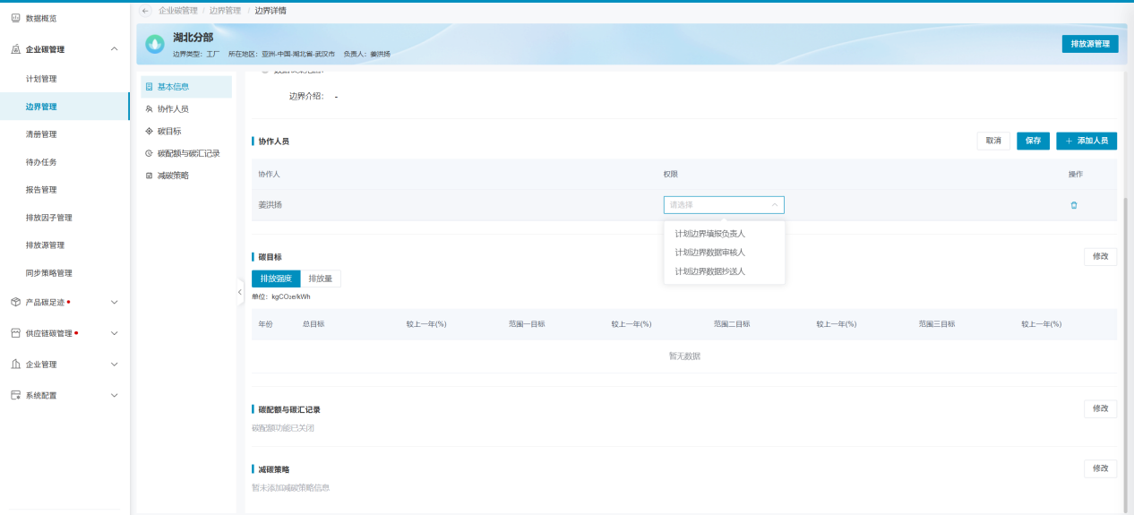 完成边界创建后,即可进入边界详细信息页面。边界信息分为五个模块:基本信息、协作人员、碳目标、碳配额与碳汇记录、减碳策略,各模块介绍如下: