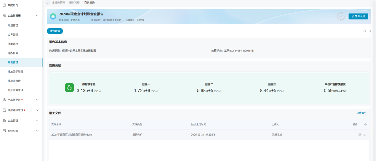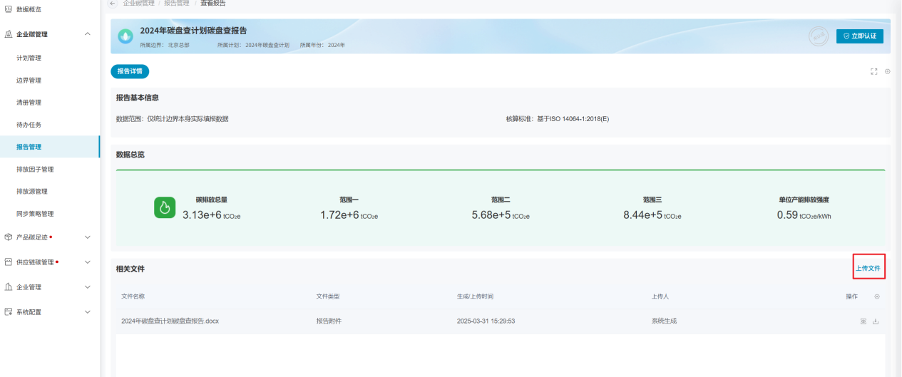 企业可将历年已经做过的碳盘查报告上传至系统内,在系统内进行数据留存,以保证企业历年碳盘查数据的完整性。上传报告时,同样是会生成一份报告数据,数据来源为自行上传;平台生成的报告的数据来源为系统生成。
