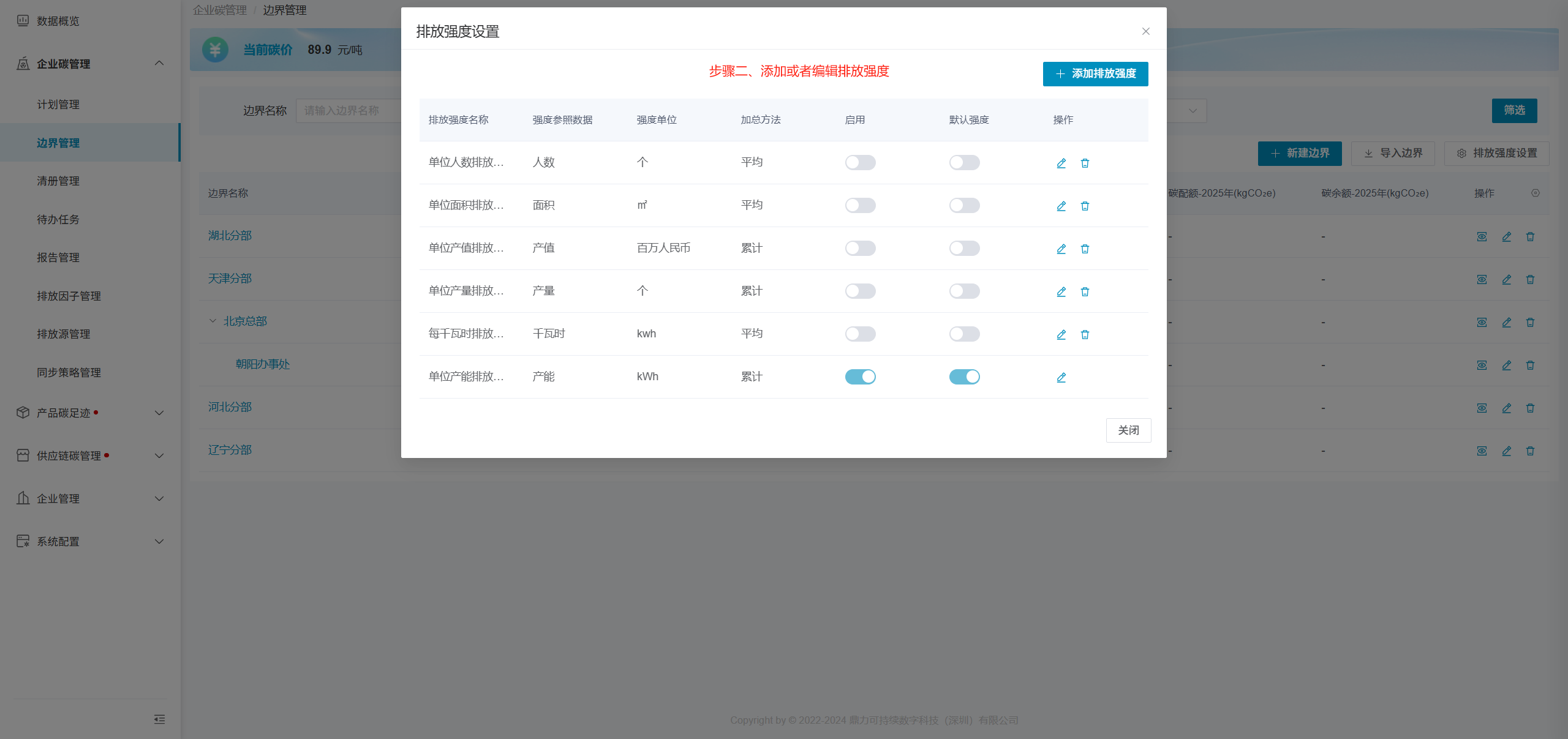 支持自定义添加排放强度,并设置排放强度的加总方法:平均:每个统计周期内的排放强度取平均值,如企业人数、企业面积;累计:每个统计周期内的排放强度取累加值,如产值、产能、产量。