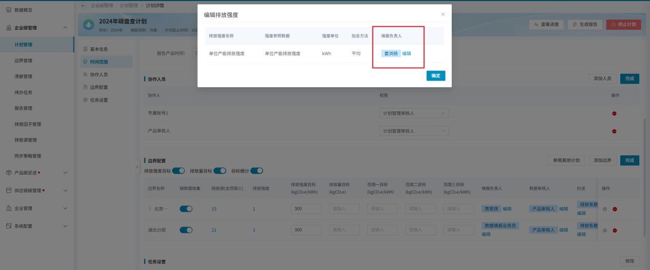 计划的基本信息里“排放强度范围”选择排放强度类型均需边界填报数值,因此需在此设置每个排放强度类型的填报人。