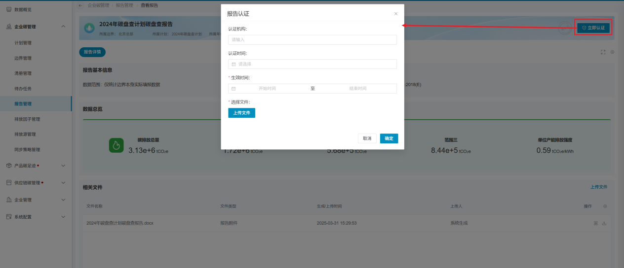 系统支持上传认证报告文件,进而标记当前报告的认证状态;点击页面上的“立即认证”按钮,在弹窗内输入认证信息即可。若当前时间超出认证报告生效时间时,认证状态将切换至未认证状态;