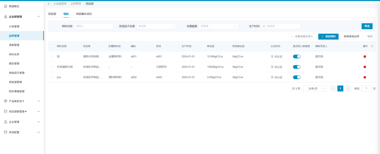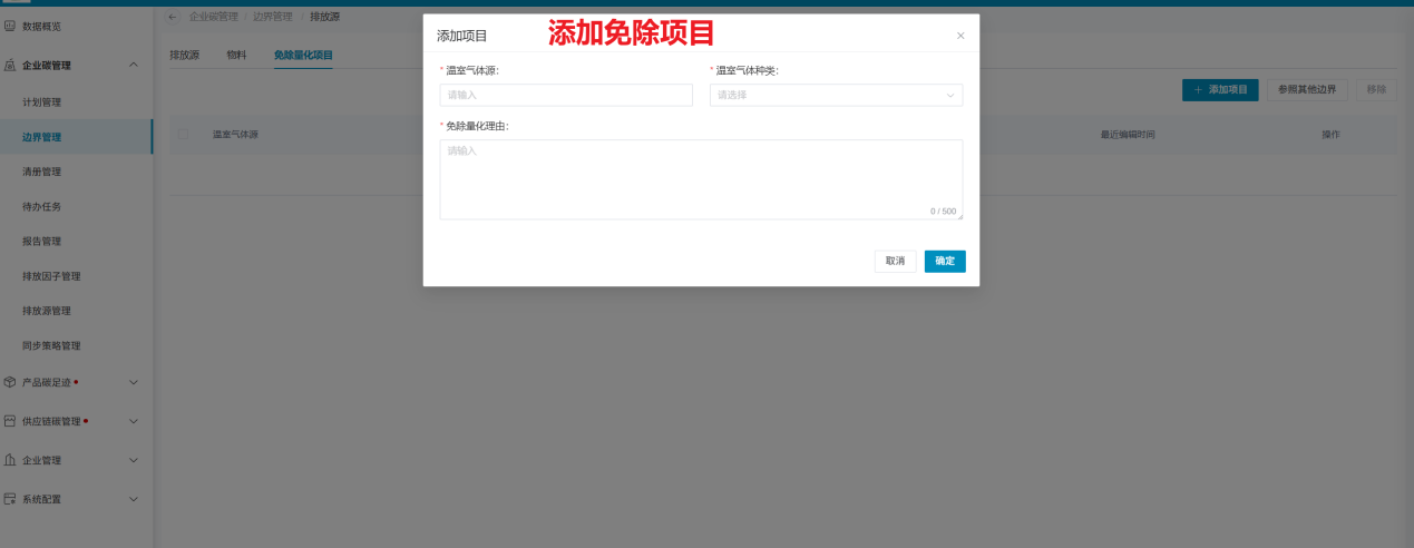 边界的排放源管理模块内,可管理边界涉及的排放源信息、采购的物料信息以及免除量化的项目信息。