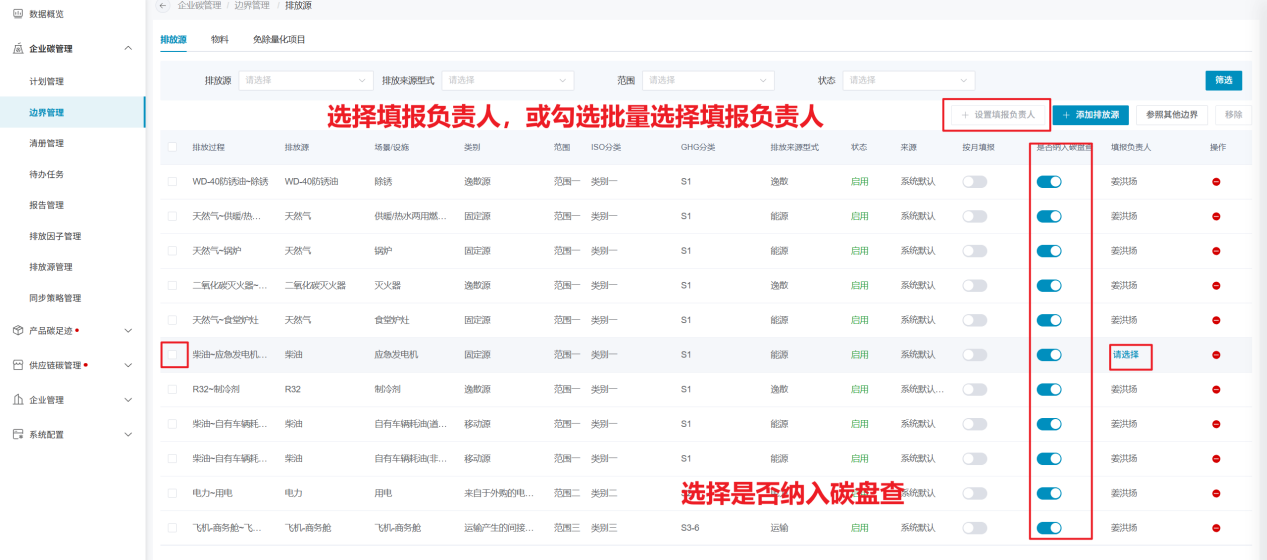 系统已将所有排放源信息配置好并提供给企业进行选取使用,边界只需根据实际情况将涉及到的排放源添加进边界即可。
