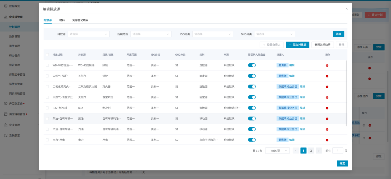 与排放源设置功能一致,边界将采购的物料添加进来,并设置好填报人后,在创建填报计划时,便可以直接将此处维护的数据直接同步。