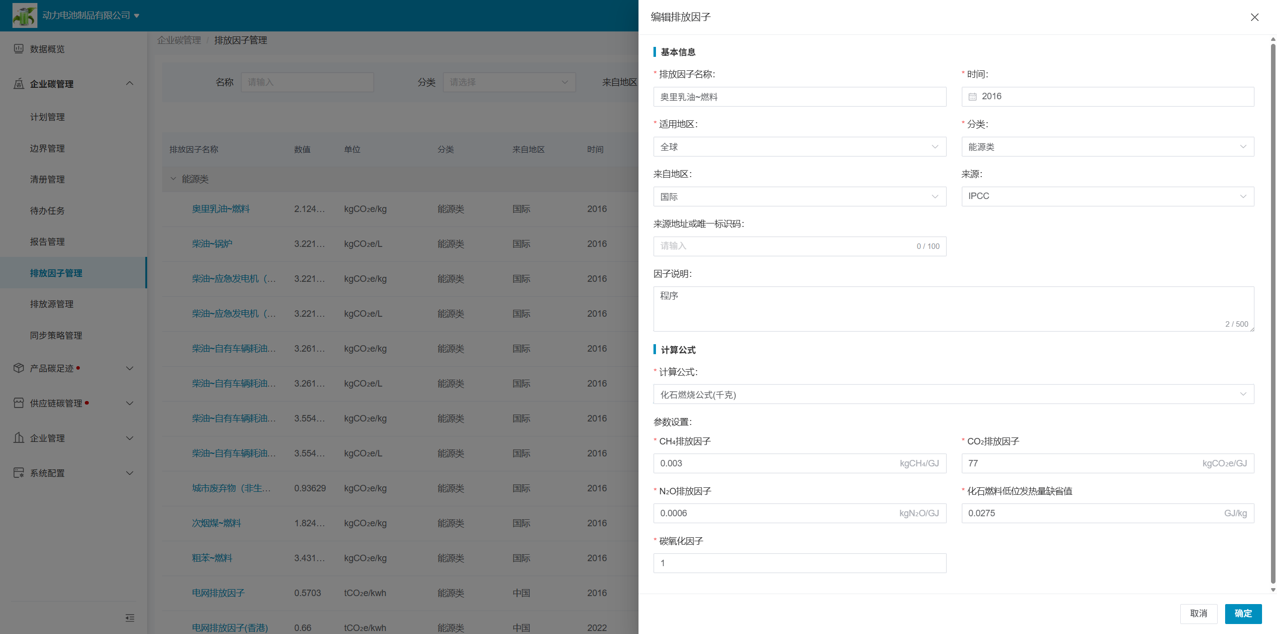 企业可自行添加/编辑排放因子,排放因子需选择现有的排放因子公式,排放因子公式包含多参数或单一参数类型,企业需根据排放因子关联的排放源,准确输入相关信息。
